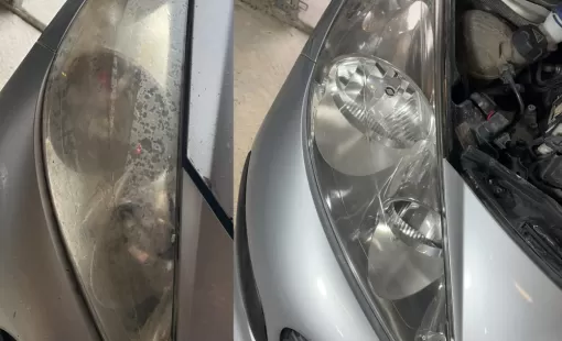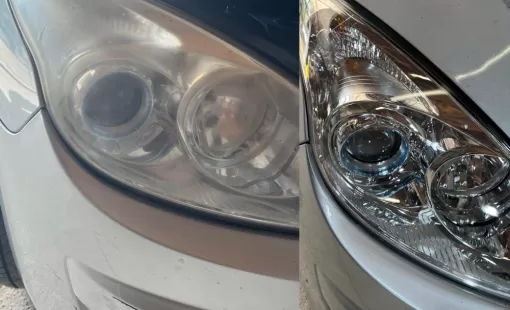 Rénovation des optiques par polymérisation sur des phares opaques. Idéal avant contrôle technique.